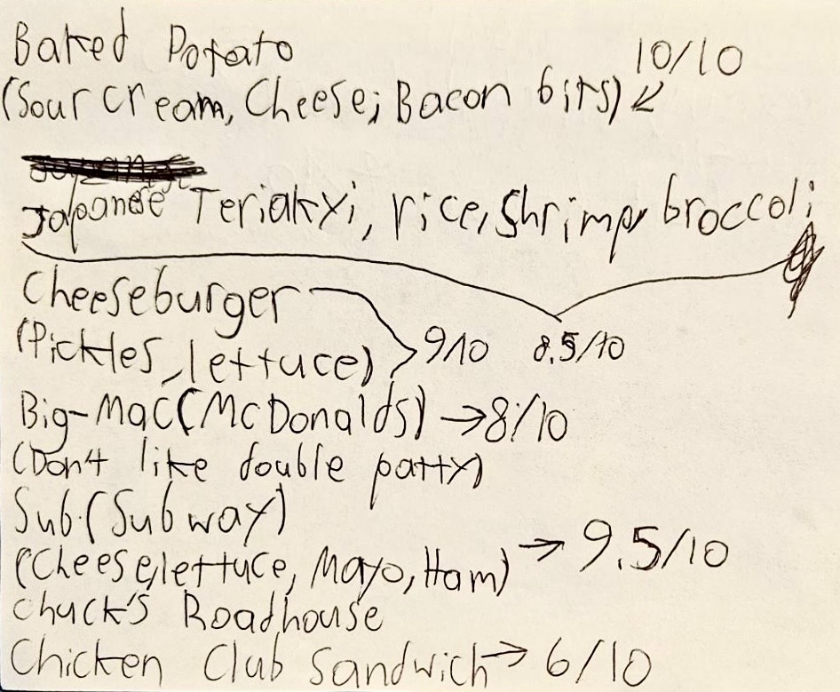 Here are a few of Lia's food lists that she proudly shares during our sessions. She enjoys tasting new foods between our visits and giving each one a score out of 10. With time, growing confidence, and the ability to make her own choices, Lia has become quite an adventurous eater!